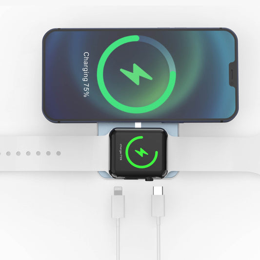 Blue 3 in 1 magsafe Fast Wireless power bank charger for phone, watch and type c electronics.